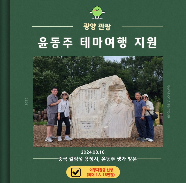 개별관광 및 윤동주 테마여행 지원 신청이 가능합니다. 지원금 및 지원방법은 아래 사이트에서 자세한 내용을 확인하실 수 있습니다.